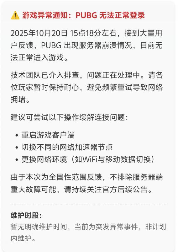 2025年10月20日15点1左右,PUBG出现服务器崩溃情况,目前无法正常进入游戏。此次故障为pubg官方游戏服务器故障,游戏官方已经安排技术进行排查,大家耐心等待官方修复,避免频繁重试导致网络拥堵。